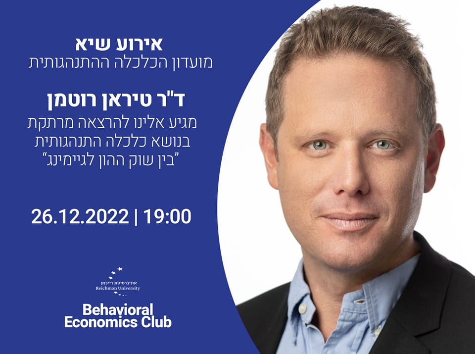 אפיון מוצר טכנולוגי נשען על התנהגות מוערכת של יוזרים או אינדיבדואלים בתחומים שונים כמו משחקים וכמו צרכנות. הכלכלה ההתנהגותית היישומית מביאה כלי השפעה על קבלת החלטות של יוזרים, עם ובלי ידיעה מודעת ויכולה להגדיל משמעותית בכלים ותובנות פשוטות את המוניטיזציה ו/או הישארות היוזרים או הצרכנים בפלטפורה. ההצראה תדון בכלים מעשיים, תציג דרכים לביצוע ניסויים בפועל על בסיס פלטפורמות דיגיטליות ותשקף דוגמאות אמיתיות מעולמות הגיימינג, הפיננסים והצרכנות.